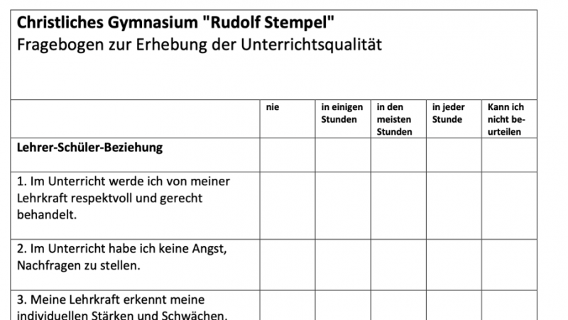 Ab dem Schuljahr 2022/23 werden bei uns monatlich verschiedene Fächergruppen evaluiert. Beispielsweise beurteilen alle SchülerInnen im Monat November die Fächer Englisch und Physik mit Hilfe eines digitalen Tools. In einem ganzen Schuljahr gelingt uns so die Erhebung zu allen Fächern. Den Fragenkatalog dazu haben wir in einer teaminternen Supervision entwickelt.